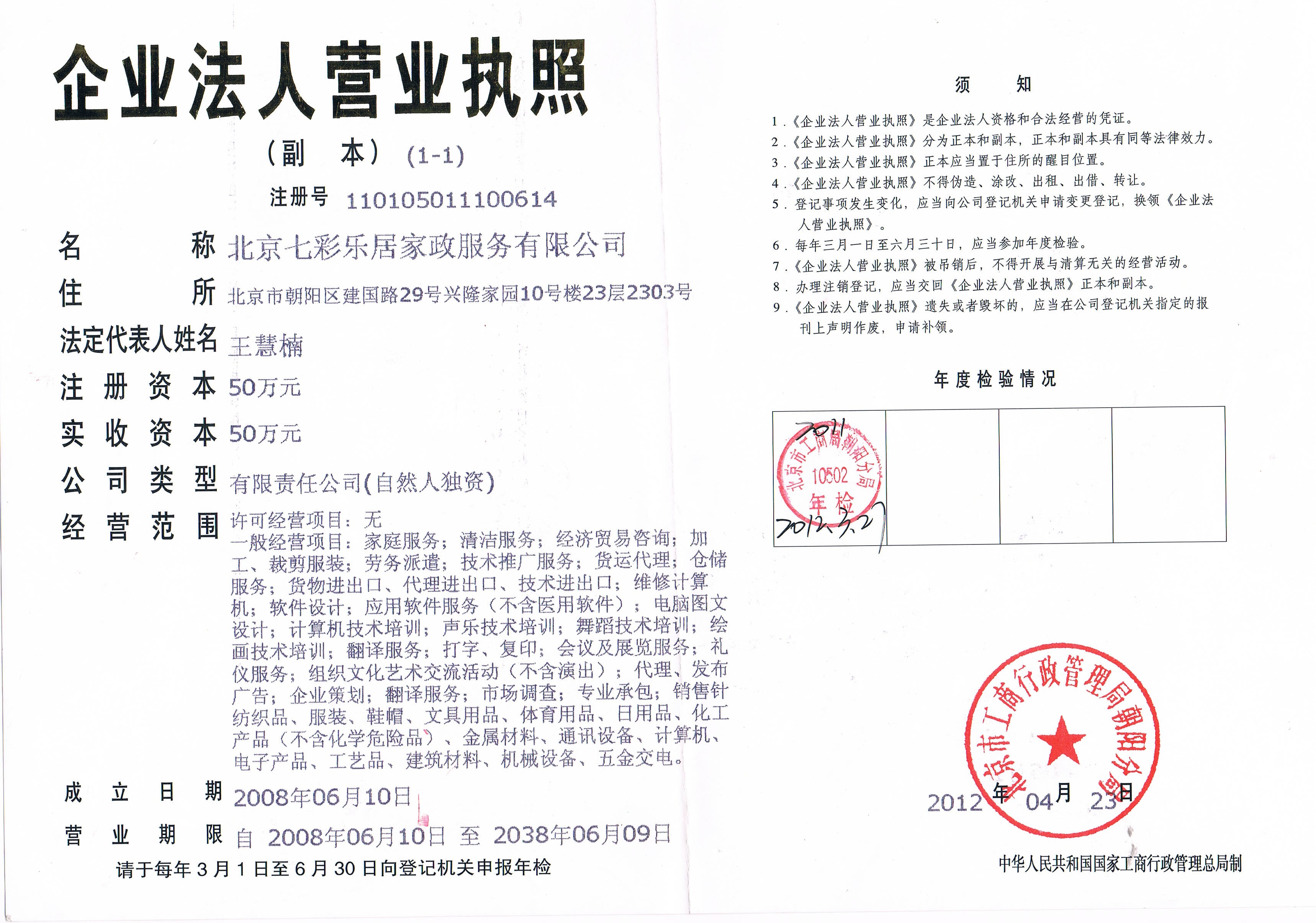 北京七彩乐居家政服务有限公司是经过工商部门注册的合法公司,具有独立法人资格。注册号110105011100614。北京七彩乐居家政服务有限公司是中国家庭服务业协会会员单位,是北京家政服务行业协会会员单位。北京七彩乐居家政服务有限公司是CCTV7《阳光大道》节目优秀保姆推荐单位。是BTV7《生活面对面》节目采访制作合作单位。公司拥有一整套完善的管理体制和高素质的家政员队伍。是具有规范服务、专业水准、特色经营的新型家政服务公司。公司根据国家关于家政服务员的职业标准,实行员工管理体制,全程跟踪服务。